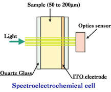 Measurement performed using fiber optic spectrometer, light source and fiber optic to transmit light with a proper wave length through electrode. Absorption take place to light which pass electrode due to reaction occur on electrode and detected by spectrometer.